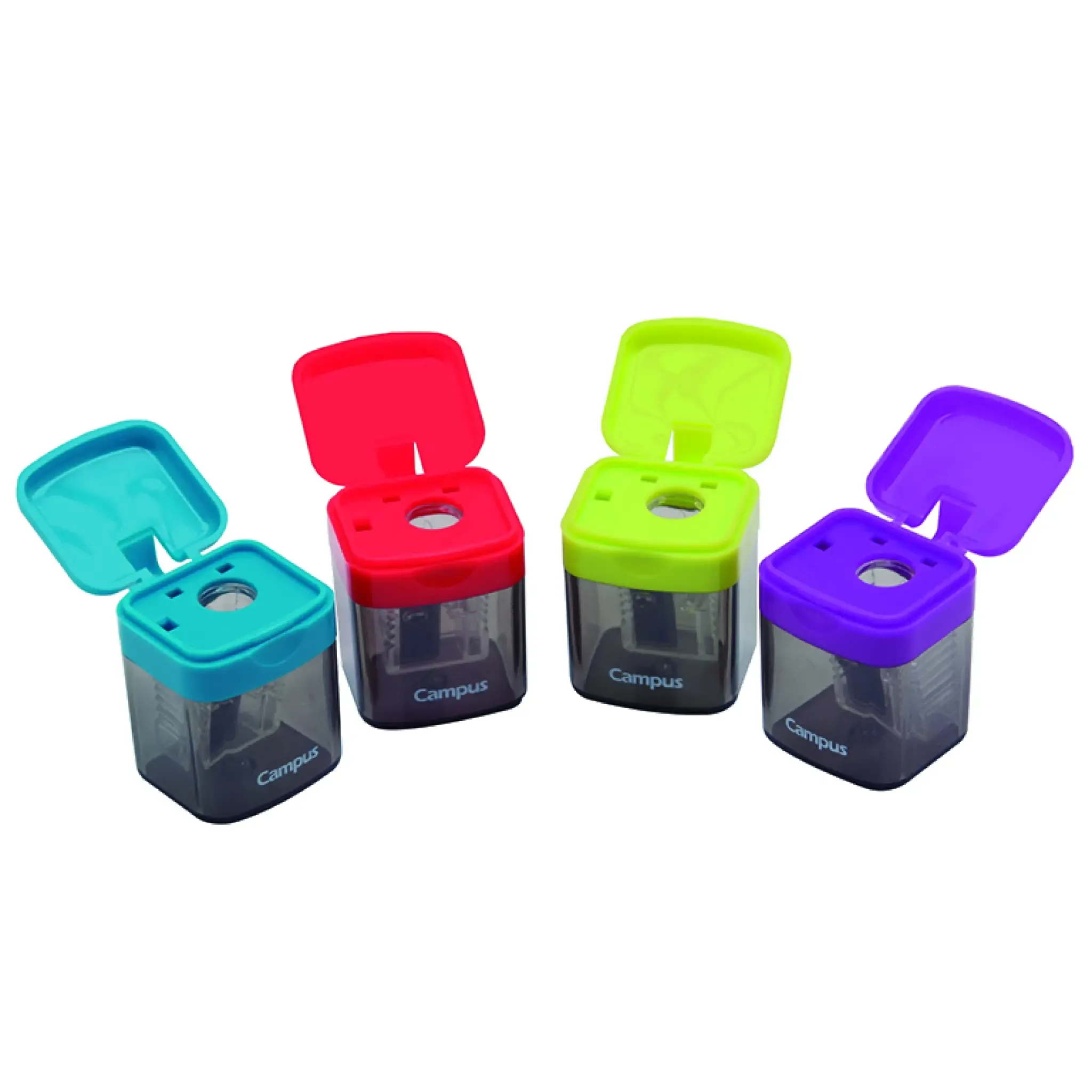 Afilalápiz con depósito color ahumado. Tapa en 4 colores: turquesa, verde, rojo y morado. Se presenta en un expositor de 24 unidades.