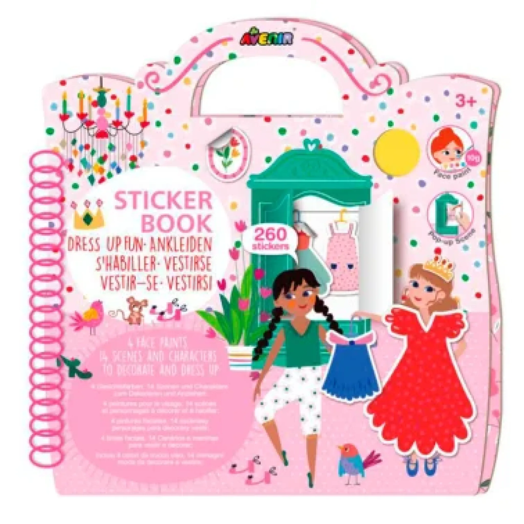 El Libro de pegatinas \u0022\u0022Diversión al Vestir\u0022\u0022 de Avenir incluye 13 ilustraciones de modelos de moda, 4 hojas de doble cara con 8 fondos (2 de ellascon diseños desplegables), 5 hojas de calcomanías, sumando un total de más de 250 pegatinas reposicionables, y 4 pinturas faciales seguras. Los niños pueden usar las calcomanías, accesorios y pinturas faciales para maquillar a las modelos. Las pinturas faciales son a base de agua y cumplen con estándares cosméticos, por lo que son seguras para la piel de los niños y se lavan fácilmente con agua.